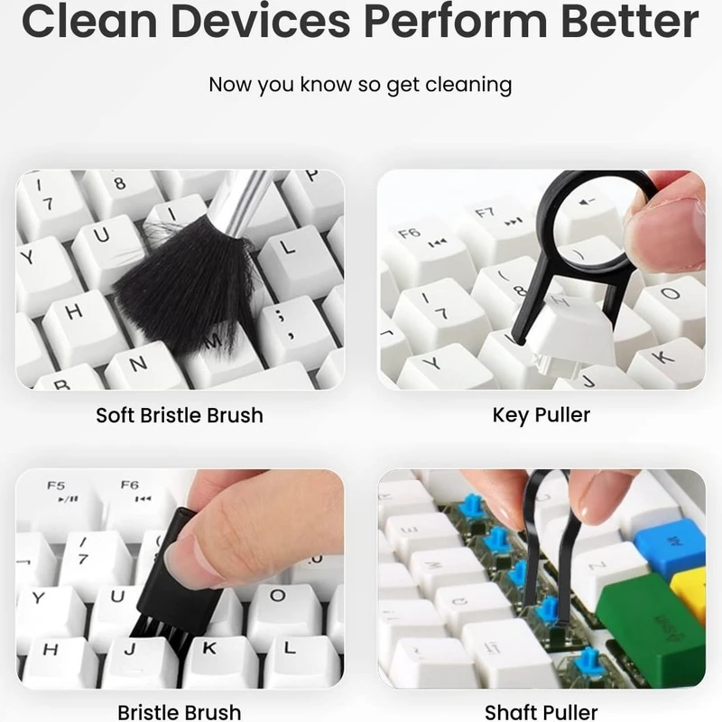 کیت تمیز کننده 18in1- این محصول یک پک کامل برای تمیز کردن تمامی لوازم الکترونیکی است. با استفاده از این کیت می توانید دستگاه هایی مانند گوشی موبایل، ایرپاد، کیبورد، دوربین، مانیتور و کنسول های بازی را به آسانی تمیز کنید. در بسته بندی این محصول یک جعبه وجود دارد که تمامی لوازم در داخل آن قرار گرفته و به آسانی قابل حمل است. بر روی درب این جعبه یک پارچه میکروفیبر وجود دارد که می توانید از آن برای تمیز کردن صفحه نمایش گوشی موبایل خود استفاده کنید. در داخل این جعبه سه نوع برس زبر کوچک و دو برس مویی بزرگ وجود دارد که می توانید از آن ها برای تمیز کردن گوشی موبایل، کیبورد و سایر لوازم الکترونیکی استفاده نمایید. همچنین این محصول دارای دو گیره برای خارج کردن دکمه های کیبورد نیز هست که به شما کمک می کند تا بتوانید کیبوردهای خود را به خوبی تمیز نمایید. این پک شامل یک سوزن سیمکارت، یک قلم تمیز کننده لنز دوربین، یک کیت تمیز کننده ایرپاد، اسپری تمیز کننده صفحه نمایش، یک پنس و یک برس تمیز کننده سوراخ نیز می باشد.